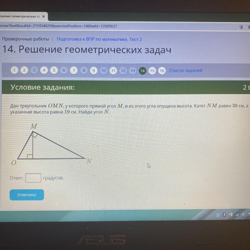 в треугольнике, если МК высота, то в треугольнике МКN катет МК равен 19, а гипотенуза МN равна 38
