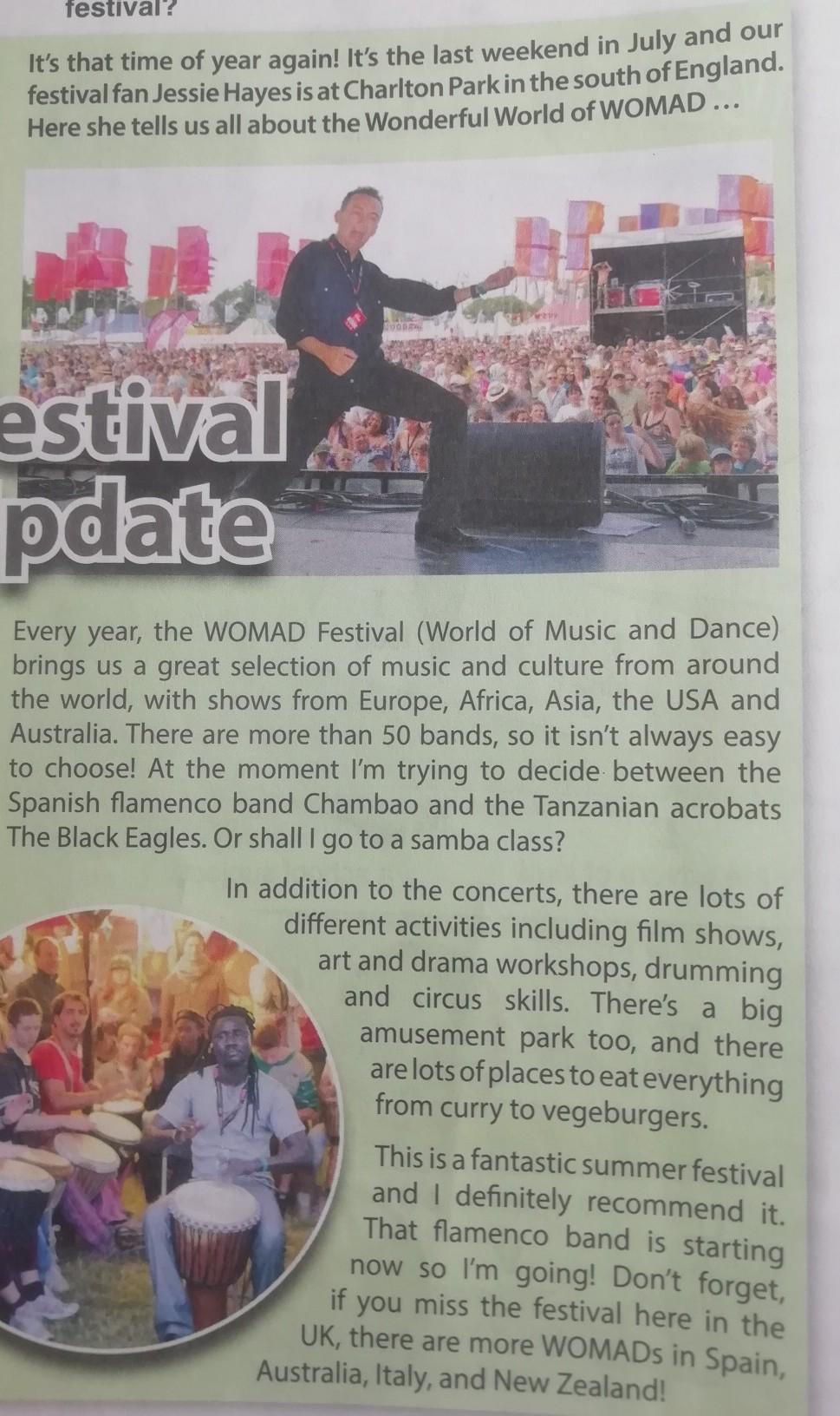 Каждый год фестиваль WOMAD (Мир музыки и танца) приносит нам большой выбор музыки и культуры со всего мира, с шоу из Европы, Африки, Азии, США. и Австралия. Групп более 50, поэтому выбрать не всегда просто! На данный момент я пытаюсь сделать выбор между испанской группой фламенко Chambao и танзанийскими акробатами The Black Eagles. Или мне пойти на уроки самбы? Помимо концертов, есть множество различных мероприятий, включая показы фильмов, художественные и театральные мастерские, игру на барабанах и цирковое мастерство. Здесь также есть большой парк развлечений, и есть много мест, где можно перекусить, от карри до вегебургеров. Это фантастический летний фестиваль, и я определенно рекомендую его. Эта группа фламенко сейчас начинается, так что я иду! Не забывайте, если вы пропустите фестиваль здесь, в Великобритании, WOMADS будет больше в Испании, Австралии, Италии и Новой Зеландии!