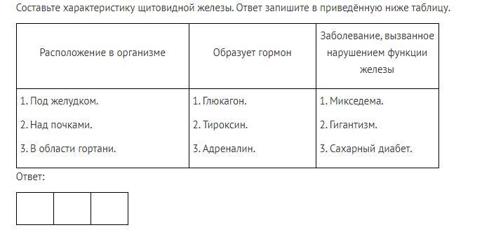 Составьте характеристику щитовидной железы. Ответ запишите в приведённую ниже таблицу.