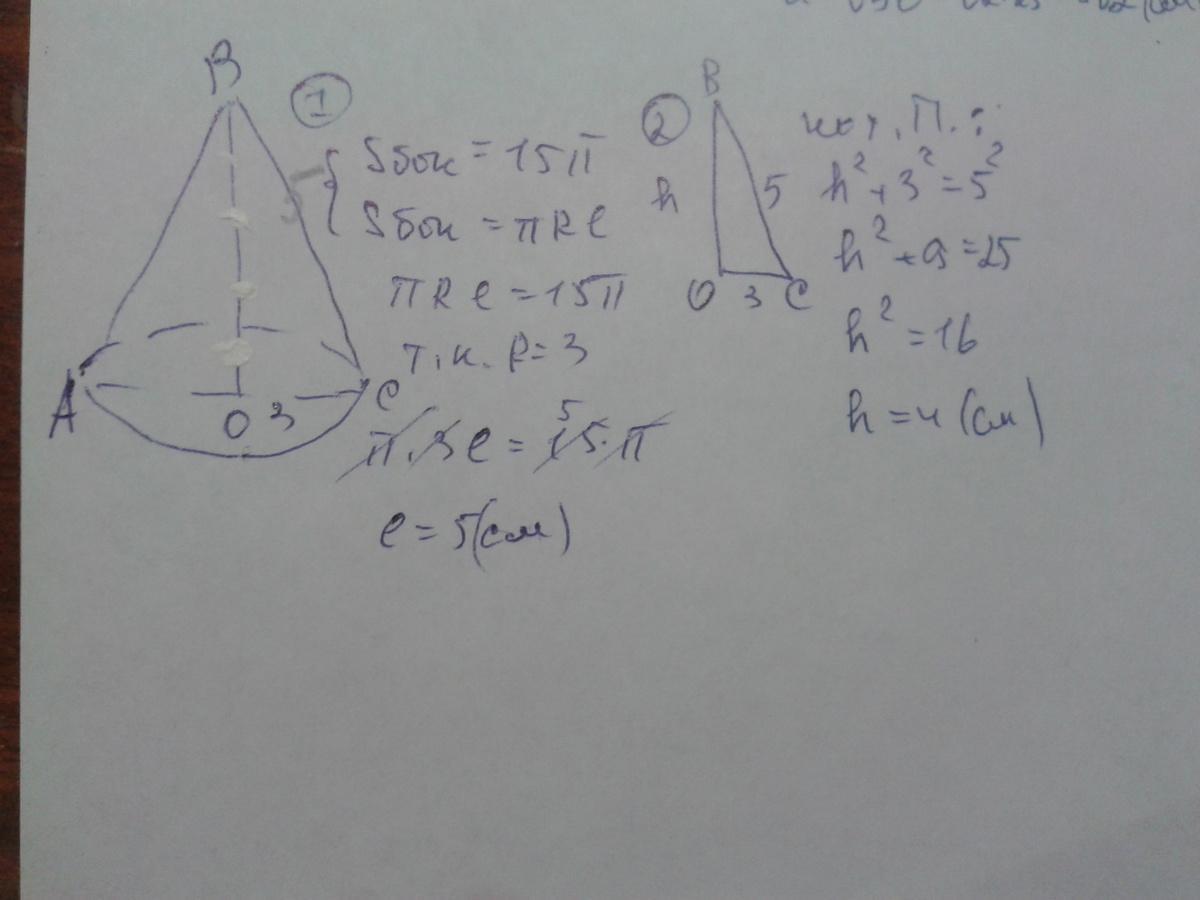 Помогите пж срочно Боковая поверхность конуса 15π см^2, а радиус основания 3см. Найти объём конуса
