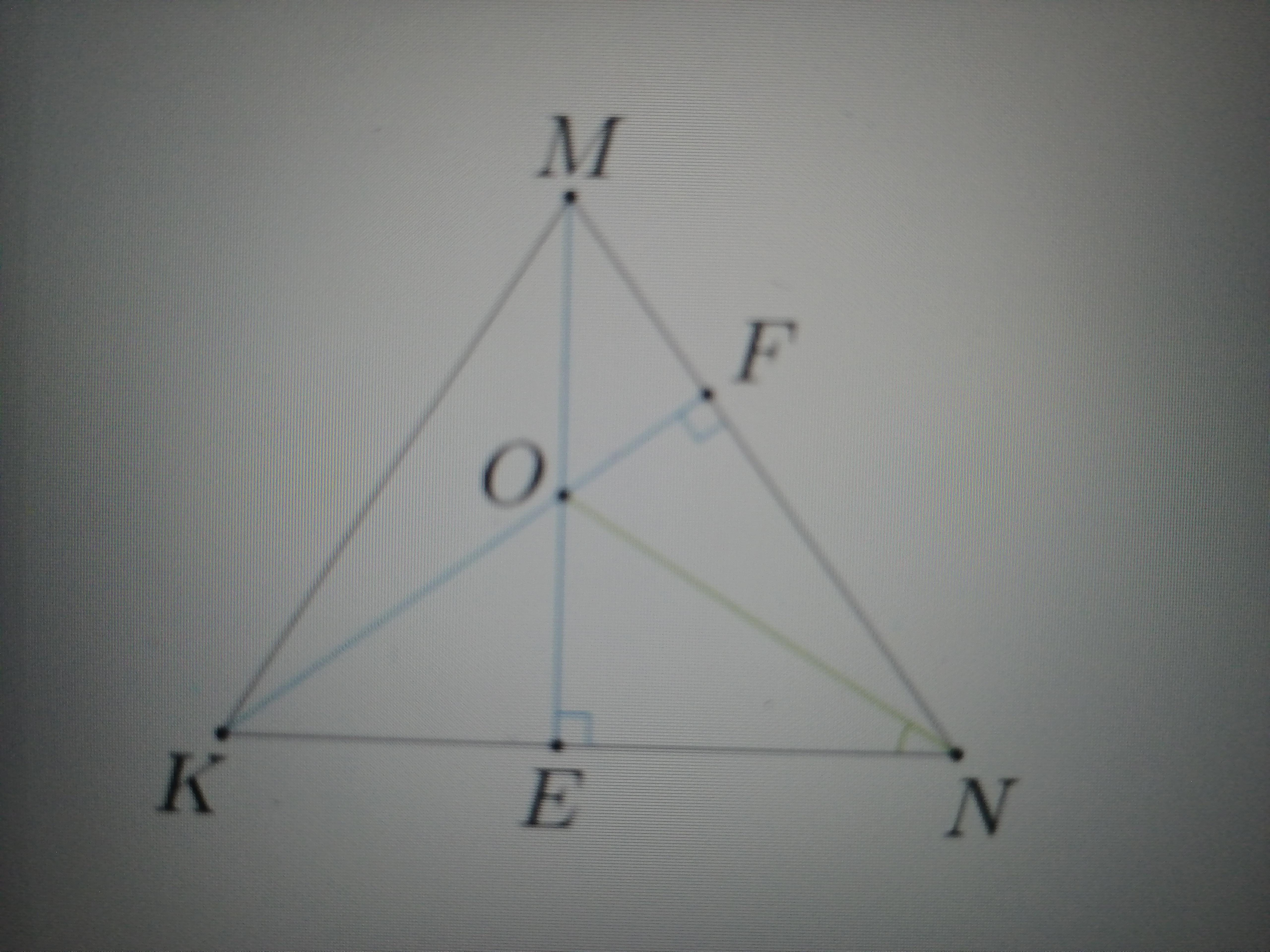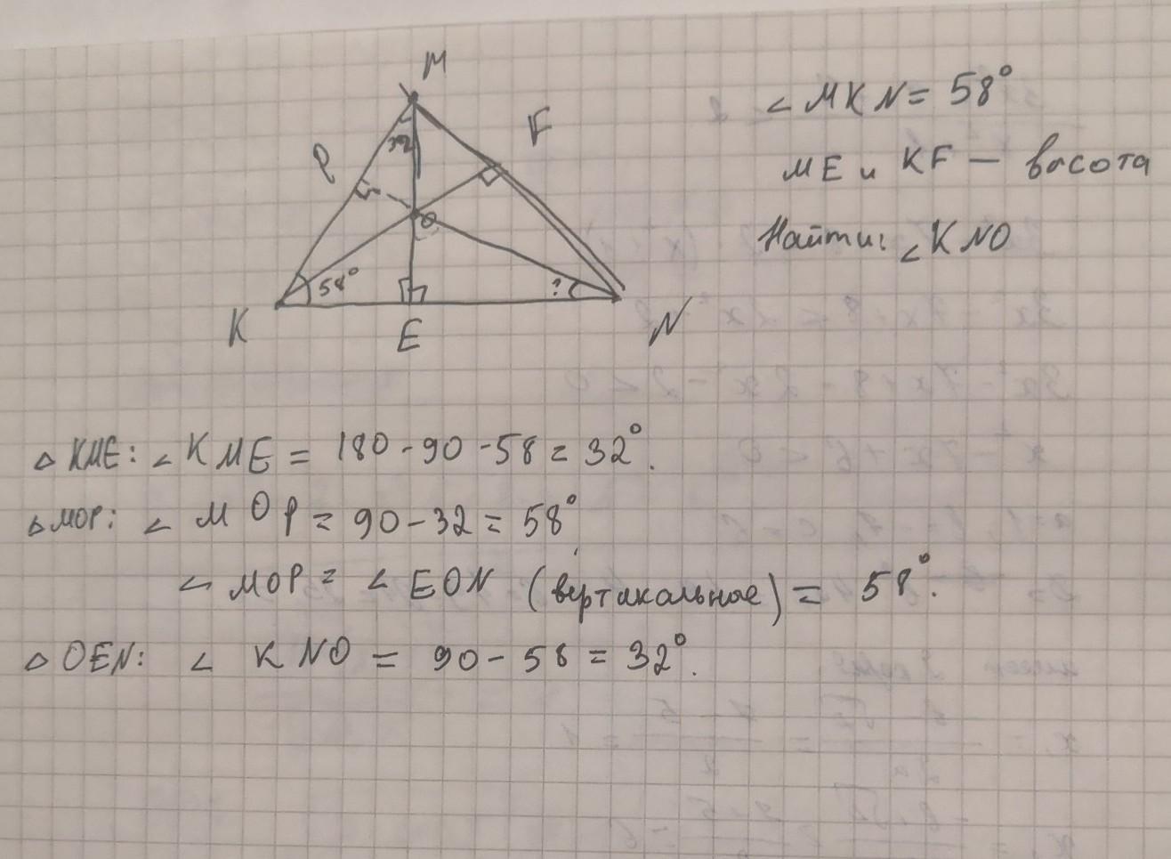 В треугольнике KMN с углом MKN =58° высоты ME и KF пересекаются в точке О.