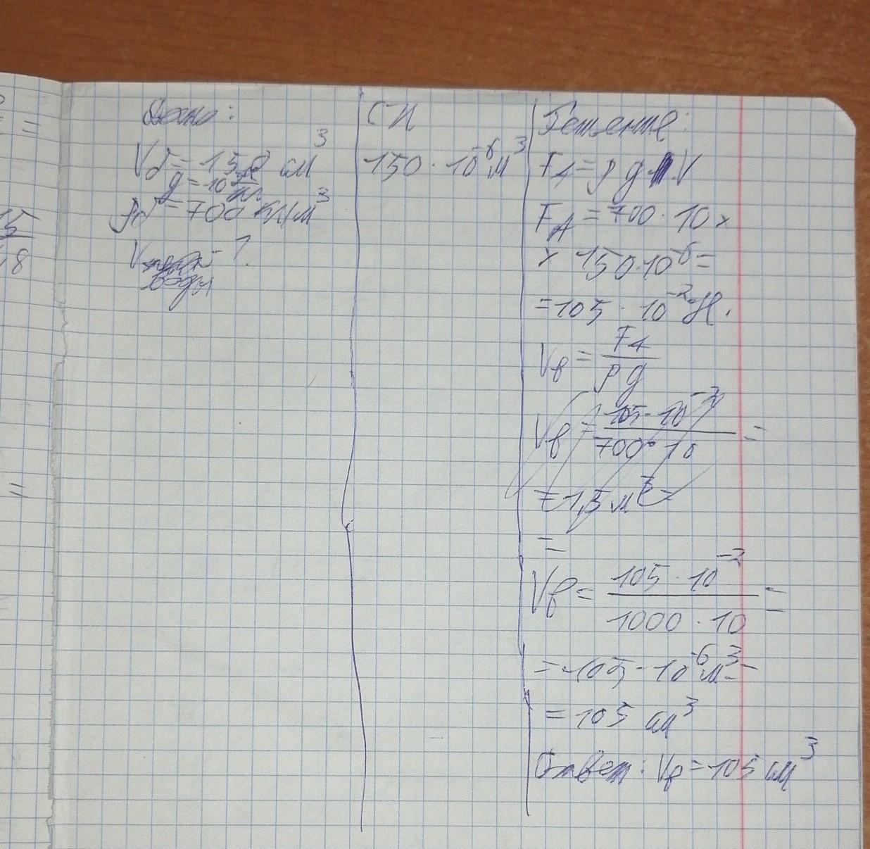 Плавающее тело вытесняет бензин объёмом 150 см³. Определи, какой объём воды будет вытеснять это тело.