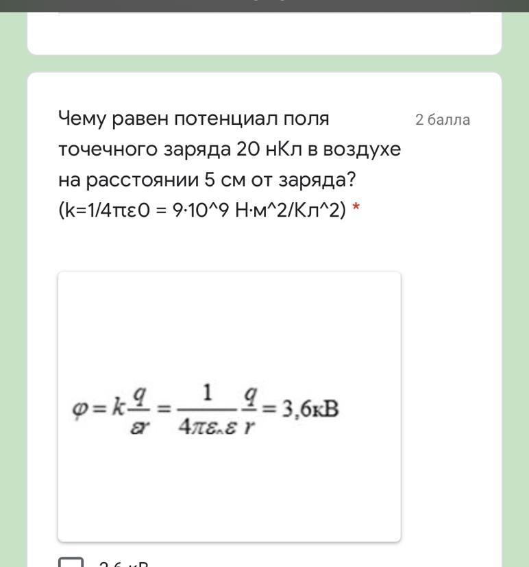 Чему равен потенциал поля точечного заряда 20 нКл в воздухе на расстоянии 5 см от заряда? (k=1/4πε0 = 9·10^9 Н·м^2/Кл^2) *