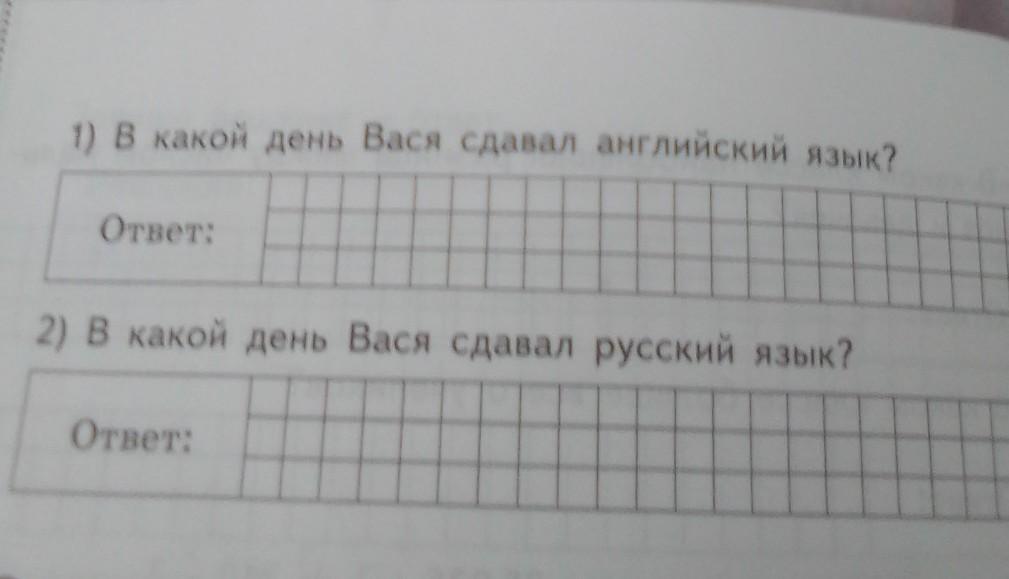 ВПР четвёртый класс номер девять страница 61 чтобы поступить в пятый класс лицея нужно с понедельника по пятницу пройти 3 вступительных испытаний по математике по русскому и по английскому языку в один и тот же день проходить два испытания не разрешается лицее повесили расписание математику можно сдать во вторник и четверг русский язык в любой день кроме пятницы язык во вторник и в среду при этом английский язык обязательно нужно сдать дом математики и русского языка Вася успешно справился со всеми тремя испытаниямию