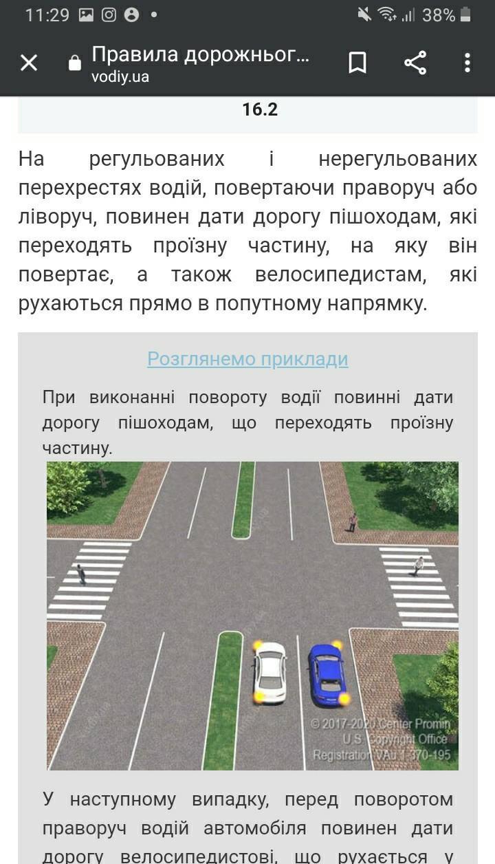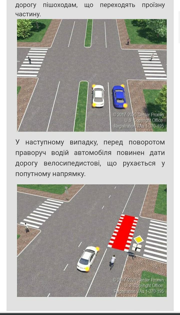 2. Проаналізуйте таку ситуацію: водій повертає ліворуч на нерегульованому перехресті. Чи повинен він дати дорогу велосипедистам, які переходять проїзну