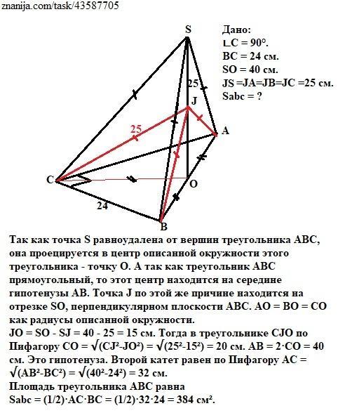 Точку простору,віддалену на 40 см від площини прямокутного трикутника, один з катетів якого дорівнює 24 см, з'єднано рівними відрізками з уcіма вершинами трикутника. Інша точка віддалена від даної точки і вершин того ж трикутника на 25 см. Обчислити площу даного трикутника.