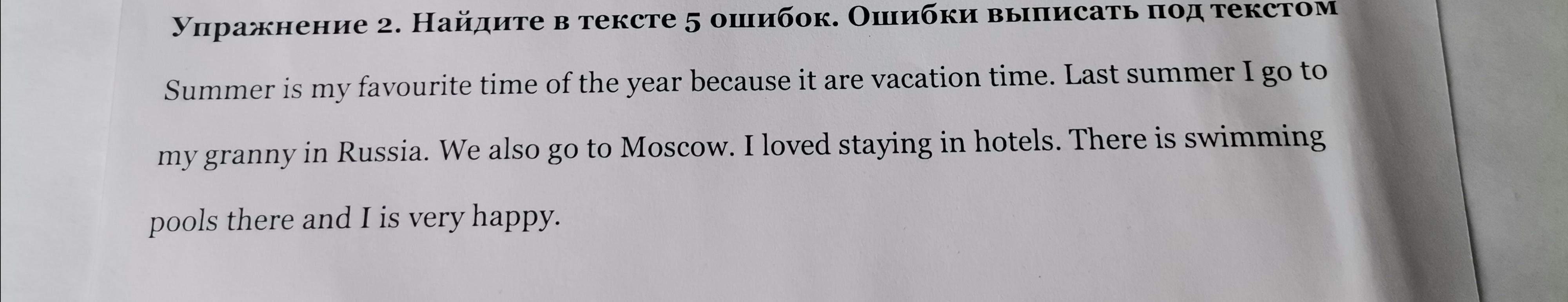 Summer is my favourite time of the year because it are (is) vacation time. Last summer I go (went) to my granny in Russia. We also go (went) to Moscow. i loved staying in hotels. There is (were) swimming pools there and I is (was) very happy.