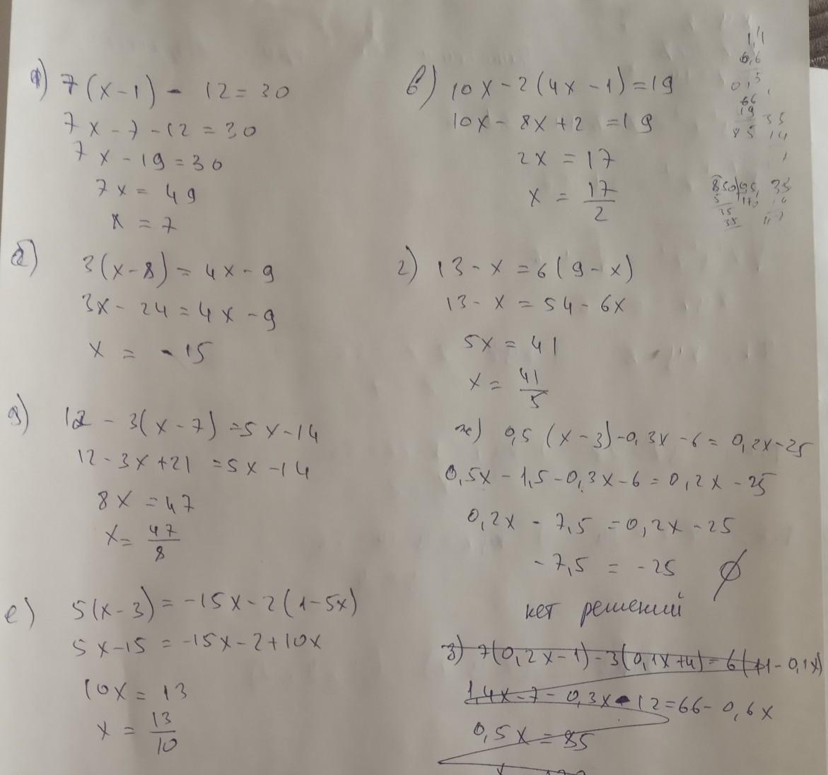 ж) 0,5(х - 3) - 0,3х - 6 = 0,2х - 25;