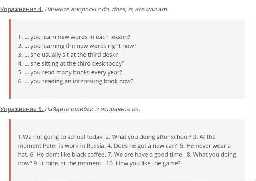 1) We don’t go to school today. 2) What are you doing after school? 3) At the moment Peter is working in Russia. 4) Has he got a new car? 5) He never wears a hat. 6) He doesn’t like black coffee. 7) We have got a good time. 8) What are you doing now? 8) It is raining at the moment. 10) How do you like the game?