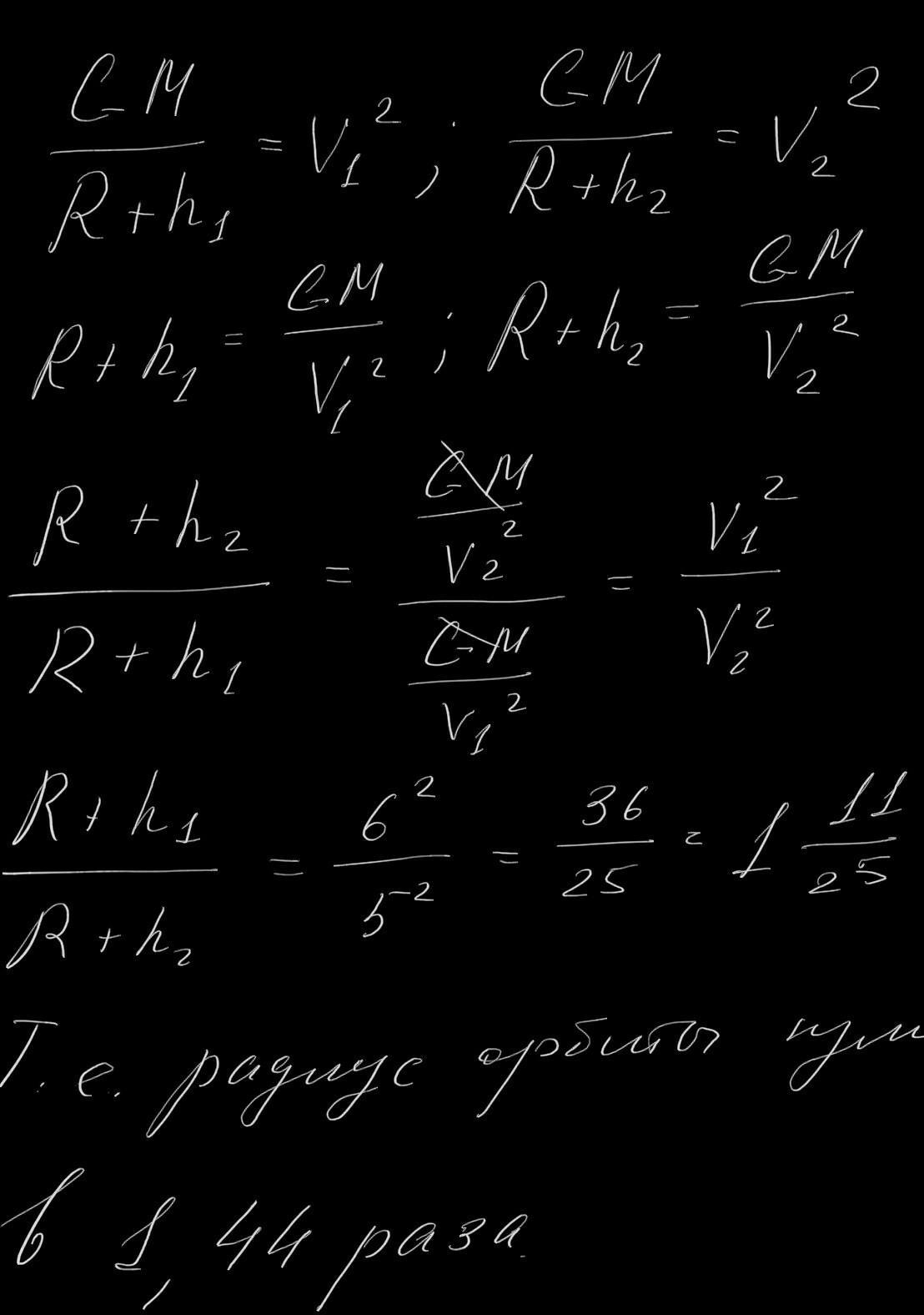 Штучний супутник землі рухається навколо землі по коловій орбіті зі швидкістю 6км/с. Після маневру він рухається навколо землі по іншій коловій орбіті зі швидкістю 5 км/с. У скільки разів зміцнилися в результаті маневру радіус орбіти і період обертання