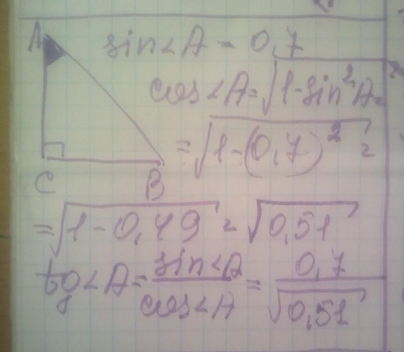 в прямоугольном треугольнике синус острого угла равен 0,7 найдите тангенс этого угла