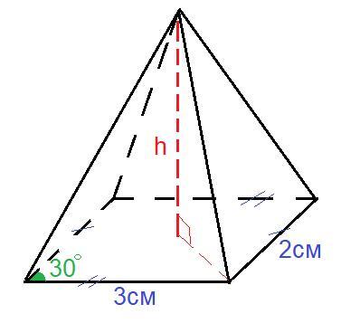объем пирамида в основании параллелограмм со сторонами 3 и 2 см и углом между ними 30° ,равен 7см^2. найти высоту пирамиды