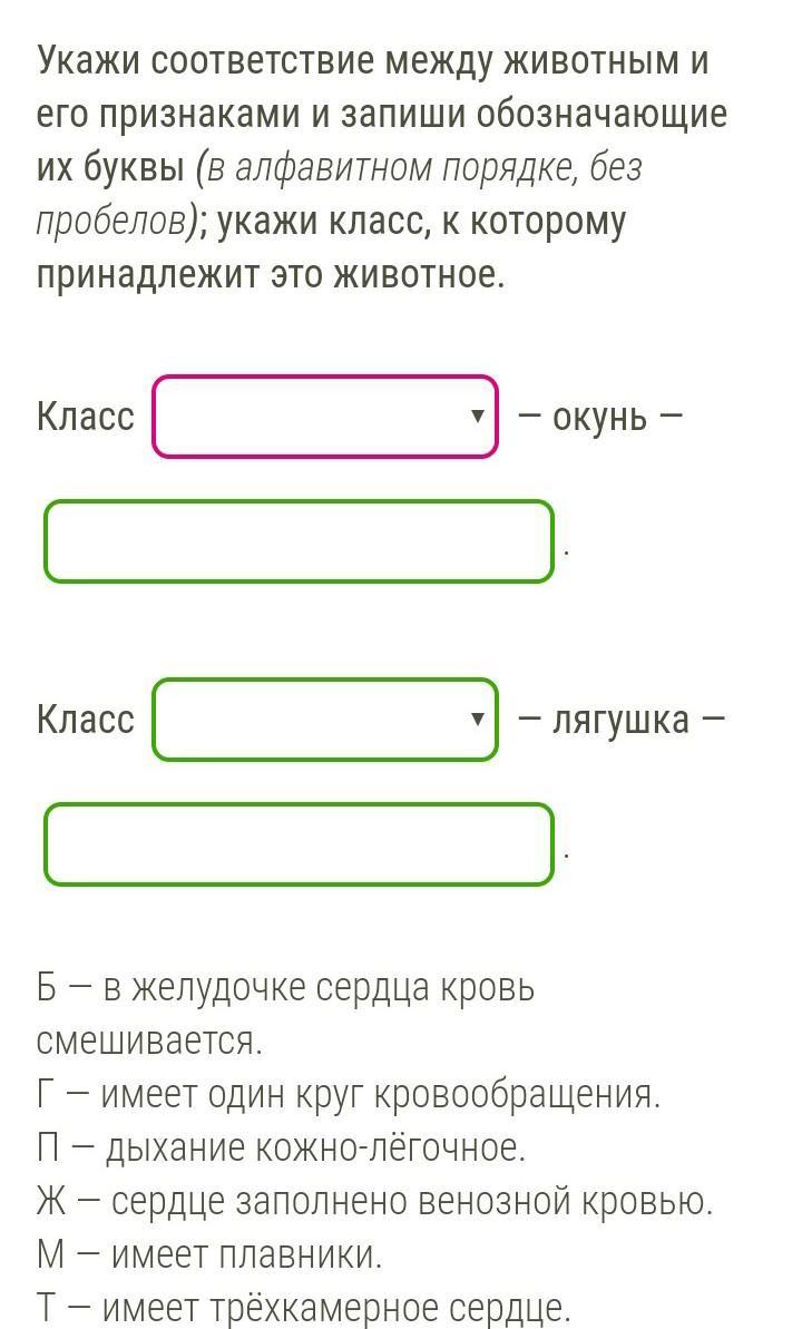 Укажи соответствие между животным и его признаками и запиши обозначающие их буквы (в алфавитном порядке, без пробелов); укажи класс, к которому принадлежит это животное.