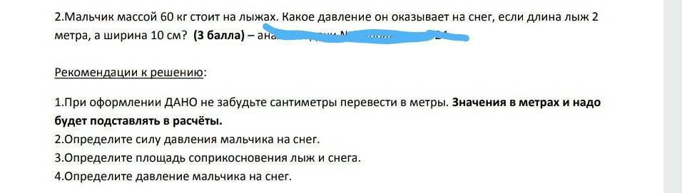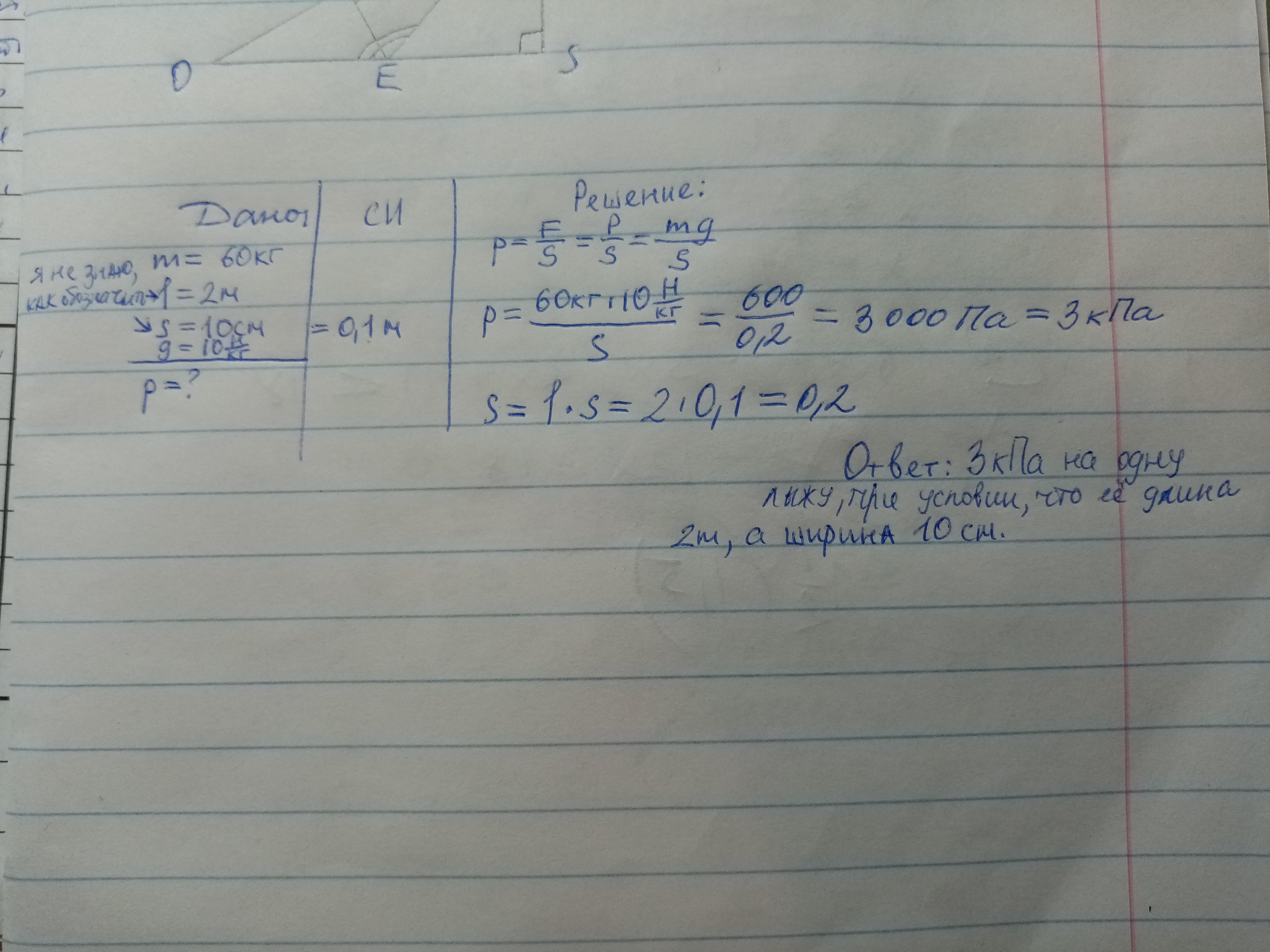 Ответ: 3 кПа на одну лыжу (это при условии, что ее длина 2 метра, а ширина - 10 см)