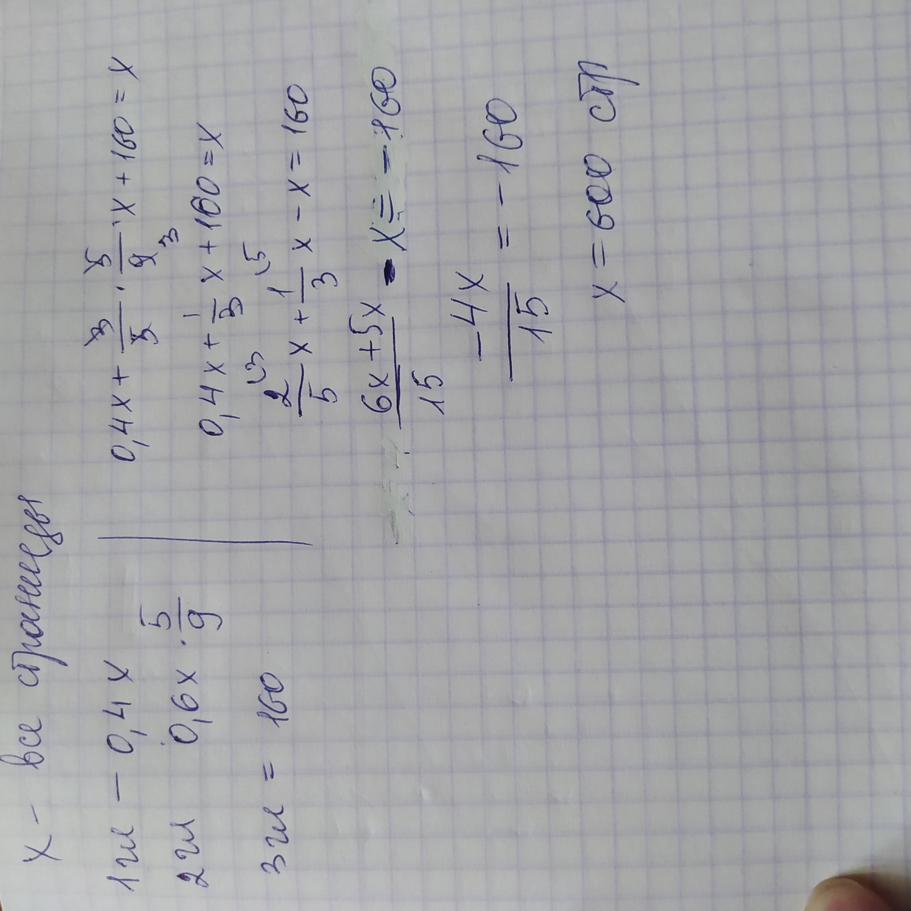Роман состоит из трёх глав. Первая глава занимает 40% всех страниц, вторая глава 5/9 отстатка, а третья 160 страниц. Сколько страниц в романе?