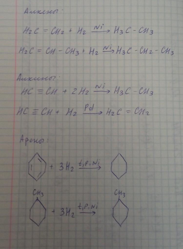Каталитическое гидрирование (+ H2, Ni, Pd, Pt). Если есть, то написать уравнение реакции. Алканы, алкены, алкины и арены