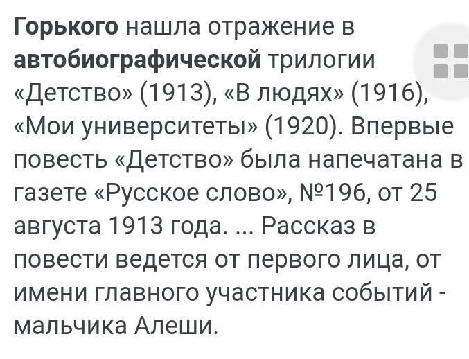 Горького нашла отражение в автобиографической трилогии «Детство» (1913), «В людях» (1916), «Мои университеты» (1920). Впервые повесть «Детство» была напечатана в газете «Русское слово», №196, от 25 августа 1913 года. ... Рассказ в повести ведется от первого лица, от имени главного участника событий - мальчика Алеши.