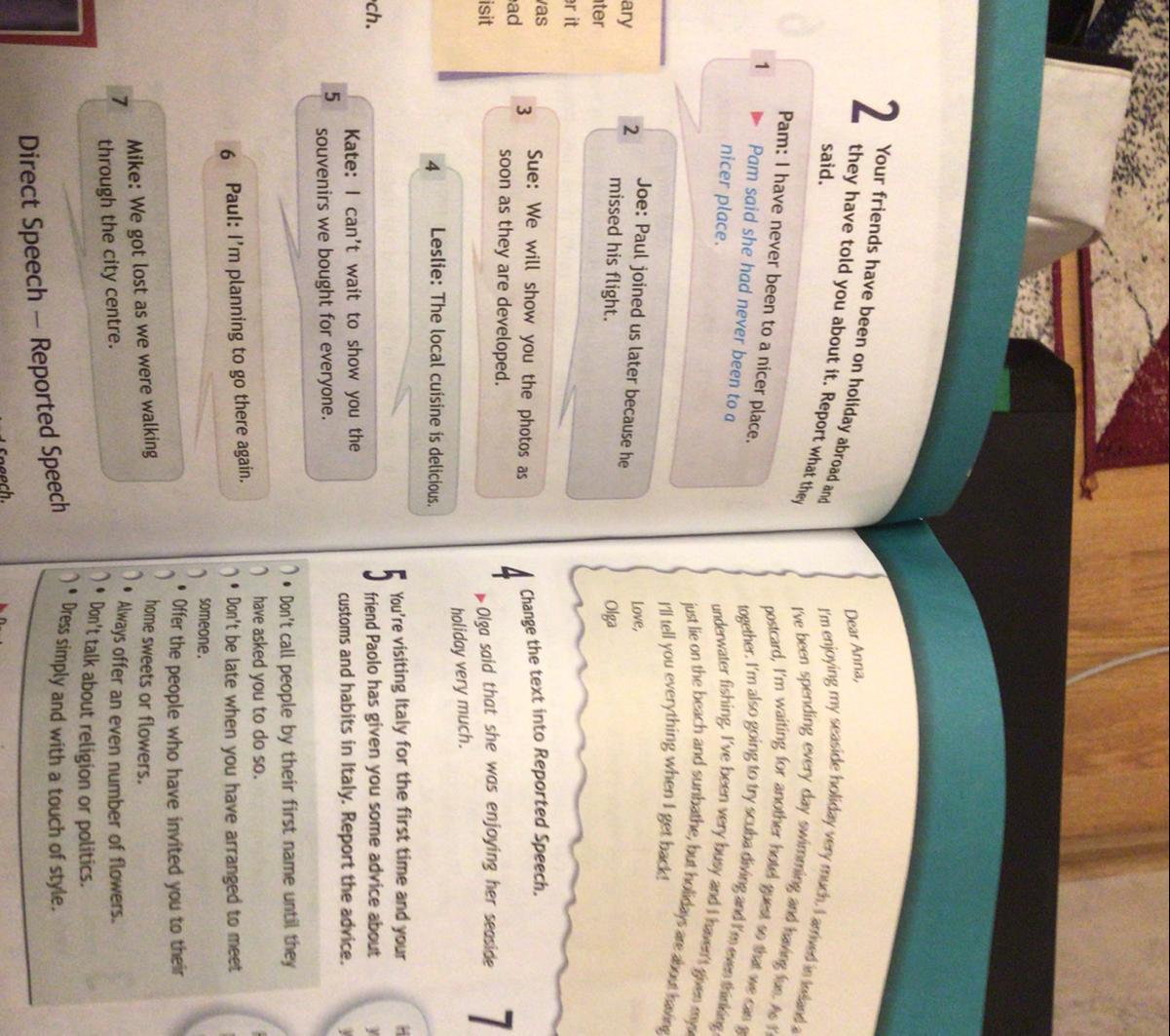 2.1 Present Perfect так как Pam не имела опыта бывать в том месте 2.2 в Past Simple так как Паул присоединился в прошедшем времени 2.3 Future Simple так как Сью покажет фотографии в будущем времени, когда будут доработаны 2.4 Present Simple так как это факт, который действителен в настоящем времени 2.5 Кейт ждет в настоящем времени, сейчас, и не может дождаться - Present Simple 2.6 Паул планирует на будущее, даже если это будущее, все планы выражаются во времени Present Continuous 2.7 Past simple и past continuous - они заблудились тогда, в прошедшем времени; Пятое задание состоит полностью из советов, а советы выражаются через повелительное наклонение. Повелительное наклонение выражается в английском в Present Simple.