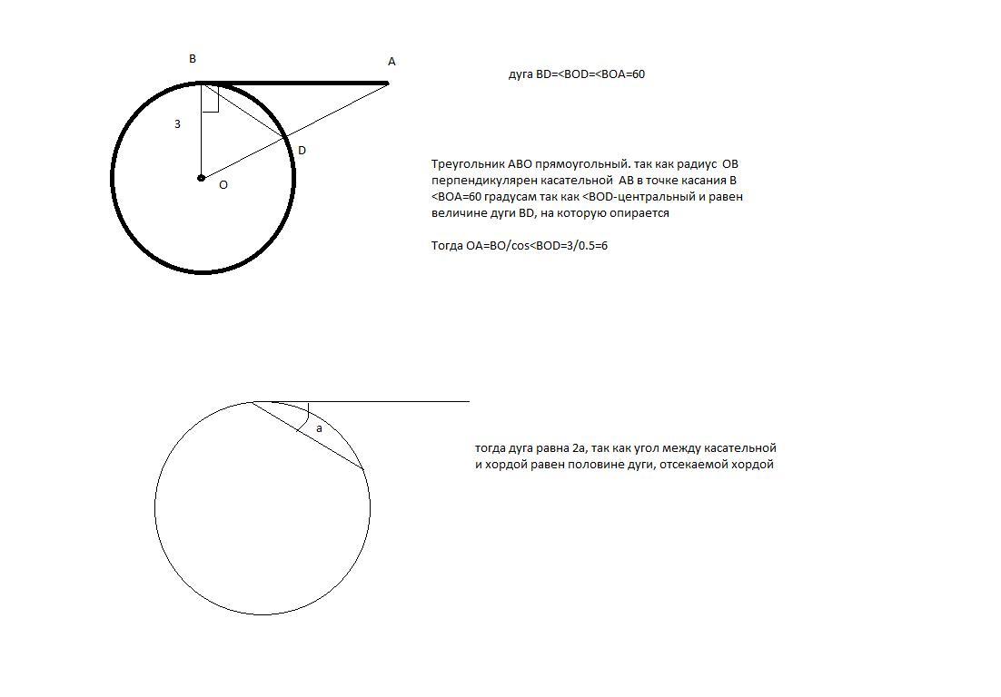 Пряма AB дотикається до кола з центром O в точці B. Знайдіть AO, якщо радіус кола – 3 см, а хорда, один кінець якої збігається з точкою дотику, а другий – з точкою перетину кола та прямої AO, стягує дугу 60°.