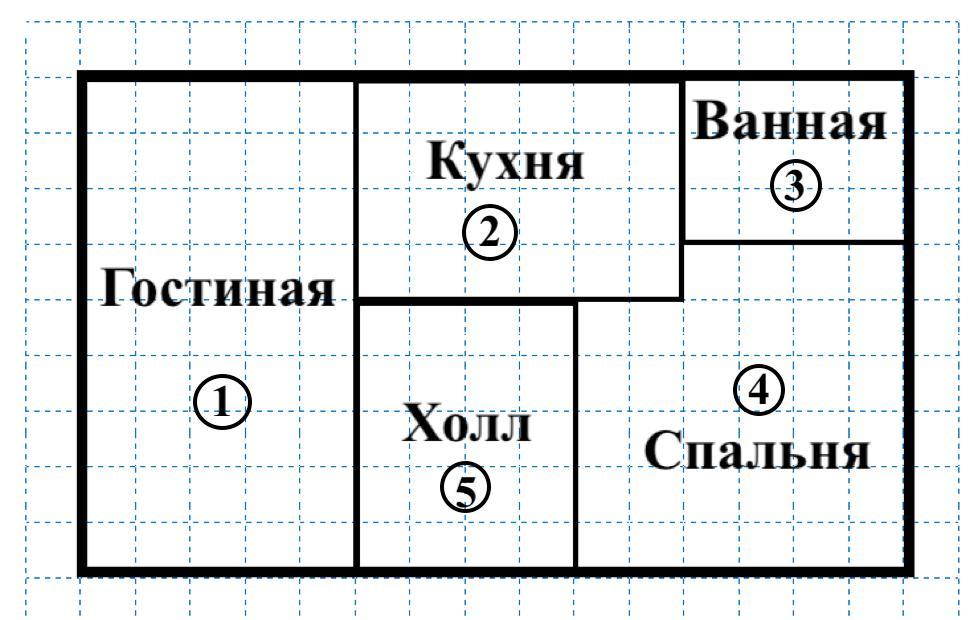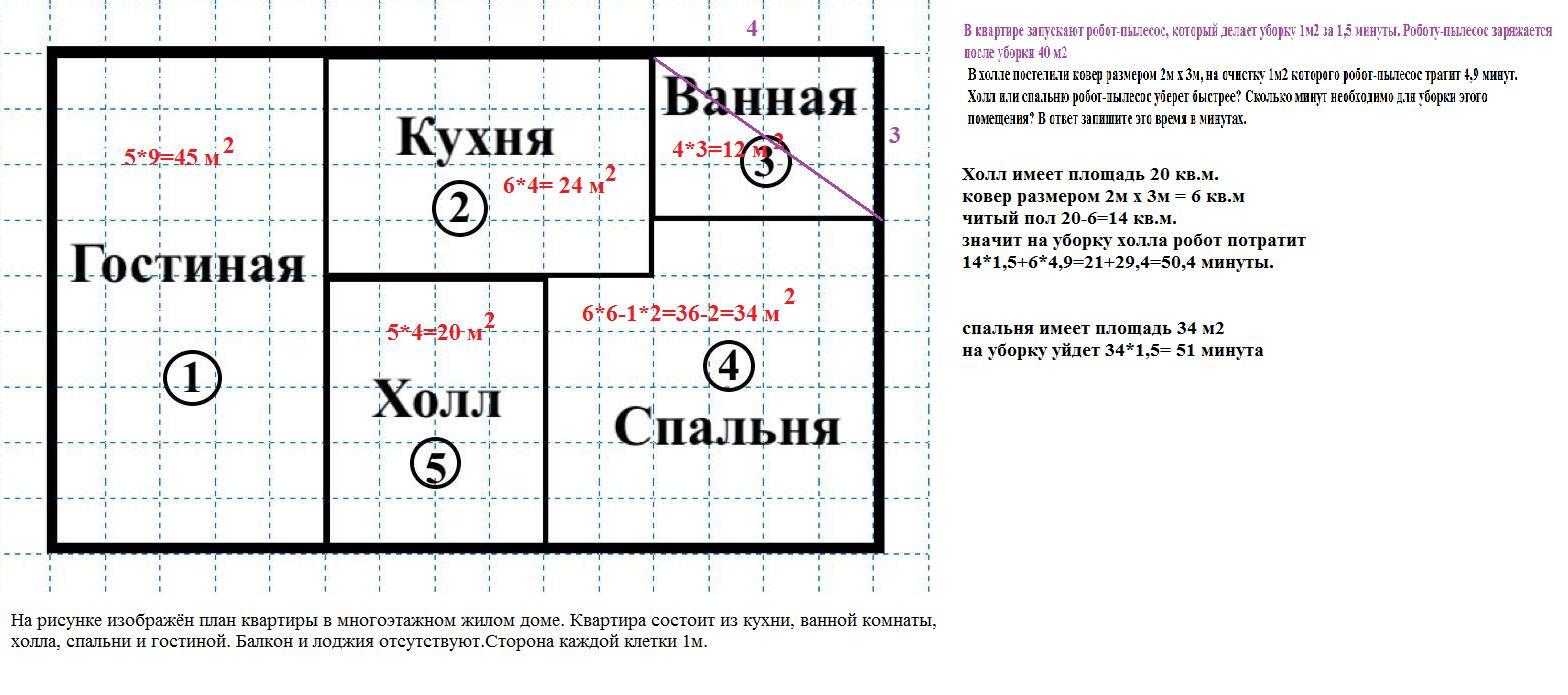 Сторона каждой клетки 1м. В квартире запускают робот-пылесос, который делает уборку 1м2 за 1,5 минуты. Роботу-пылесос заряжается после уборки 40 м2