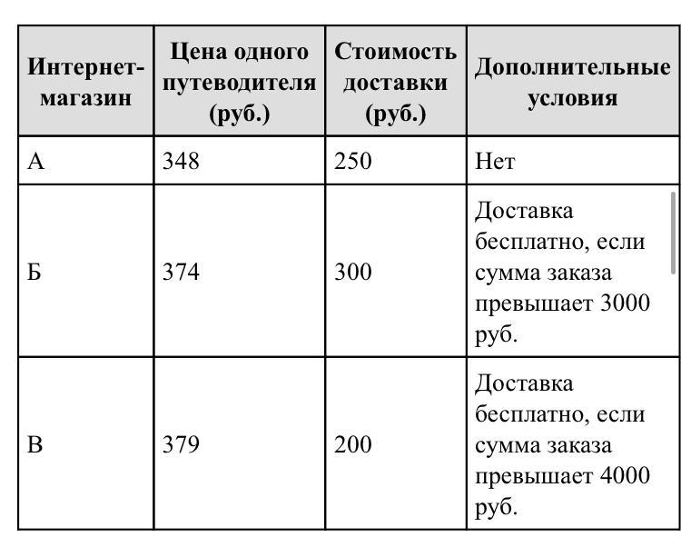 Для группы иностранных гостей требуется купить 10 путеводителей. Нужные путеводители нашлись в трёх интернет-магазинах. Условия покупки и доставки даны в таблице.