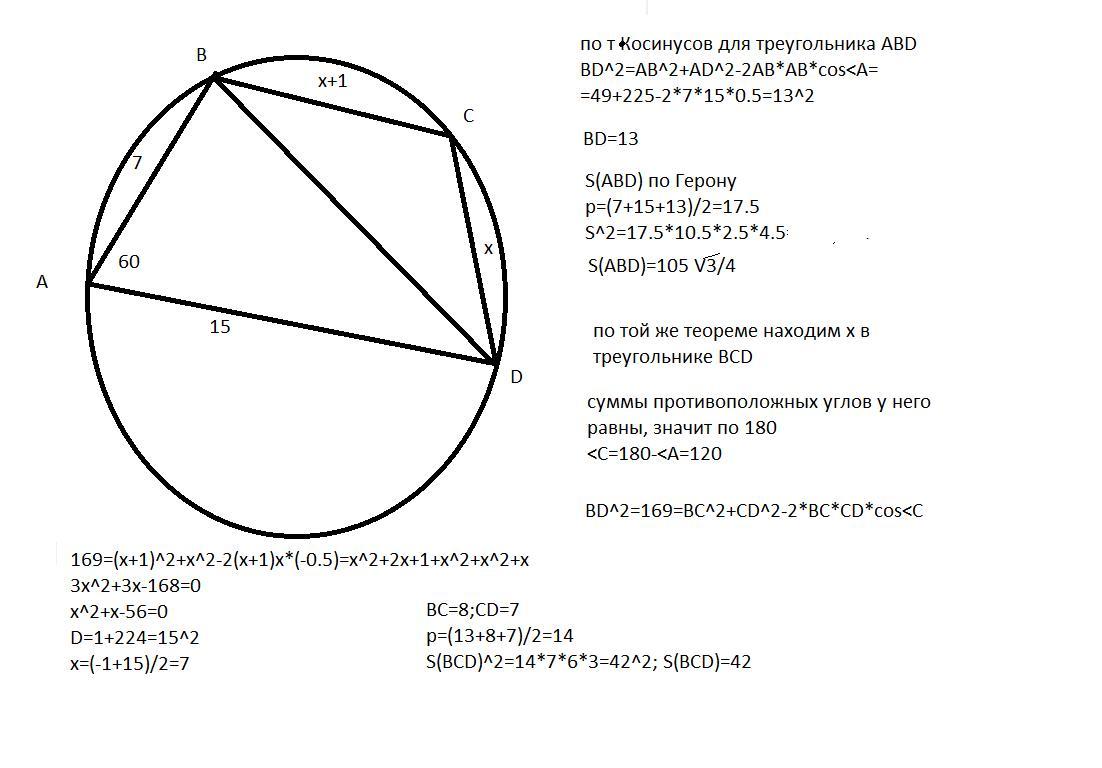 Окружность вписана в четырёхугольник ABCD, AB и AD образуют угол в 60°, AB=7см, AD=15см, BC-CD=1. Найти длину диагонали BD и площади треугольников ABD и BCD.