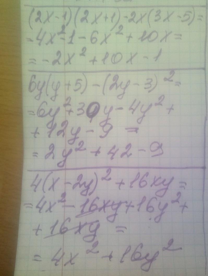 4. (2х-1)(2х+1) - 2х(3х-5) = 4х² - 1 - 6х² +10х = -2х² + 10х - 1