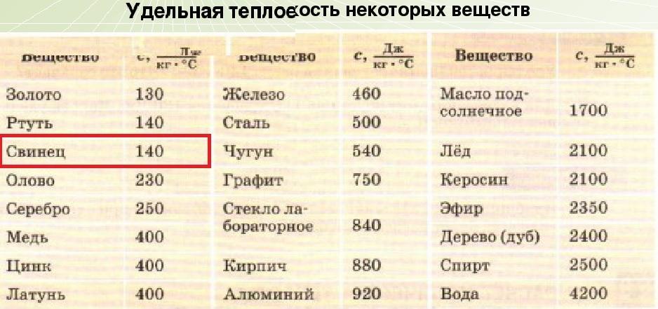 Из какого материала сделана деталь, если при ее нагревании от +10’C до +100’C она получила 630 J теплоты? Масса детали 50 г.
