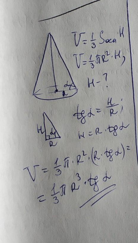Знайдіть об'єм конуса, якщо радіус його основи дорівнює R, а твірна утворює кут а. з площиною яка основи конуса