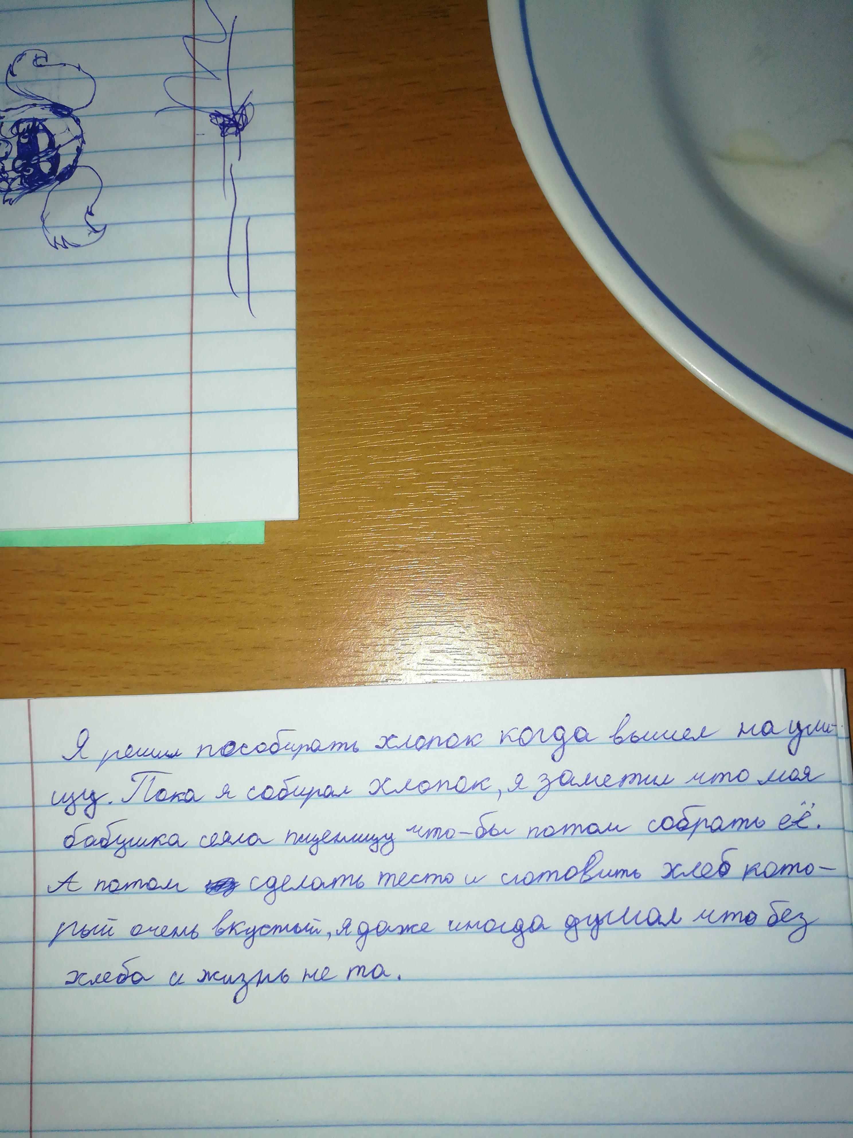 Хлеб - это святая пища. Много труда уходит м уже ушло на выращивание пшеницы, полив, собирание хлопков, а потом ещё нужно его приготовить. Хлеб не раз выручал нас в походах, на войне. Ни что не может нас насытить так, как он. Без хлеба - как без рук. Много песен и поговорок повествует об этой свещенной пищи. Без хлеба - и жизнь не эта!