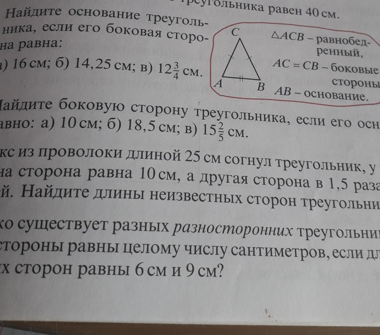 периметр равнобедренего треугольника равен 40 см 1)найдите основание треугольника,если его боковая сторона равна: а)16 см б)14,25 в)12 3/4