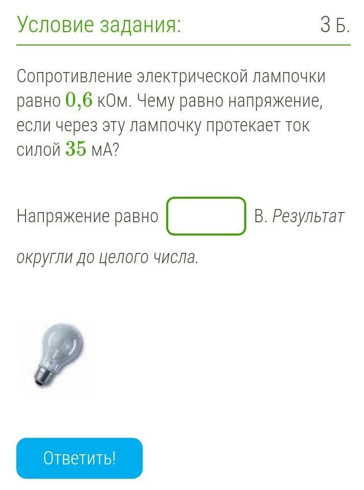 Сопротивление электрической лампочки равно 0,6 кОм. Чему равно напряжение, если через эту лампочку протекает ток силой 35 мА?