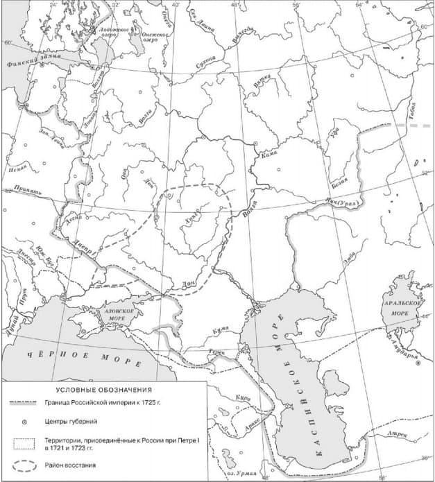 если я не ошибаюсь, то на карте показаны границы Булавинского восстания 1707-1708гг. Предводителем которого был Булавин Кондратий Афанасьевич.