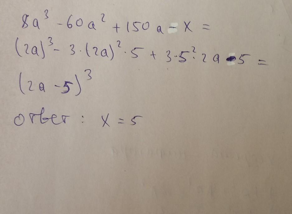 Чему равно х ,если выражение 8a³-60a²+150a+x является кубом разности двух выражений?