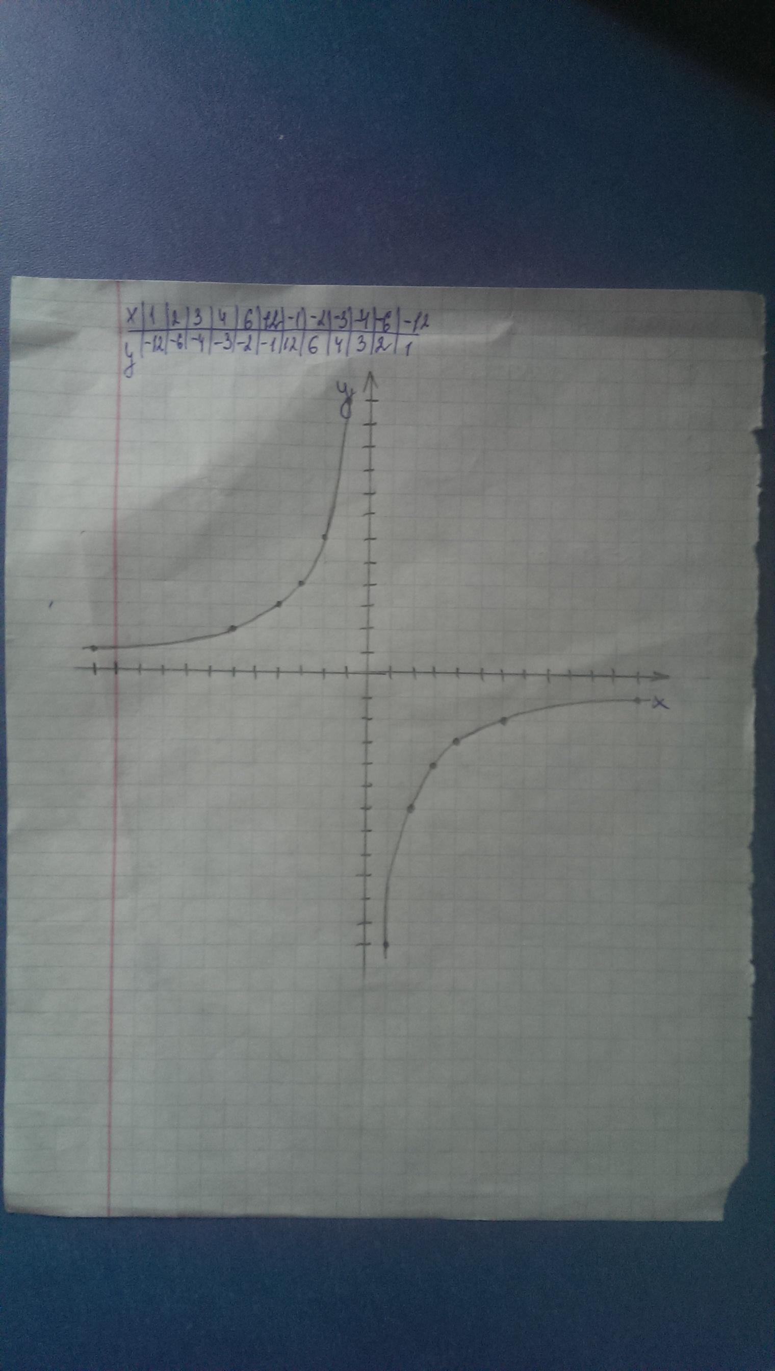 Построй график функции y=-12/x и ответь на вопросы: а) каким значениям аргумеyта х соответствуют отрицательные значения функции у;