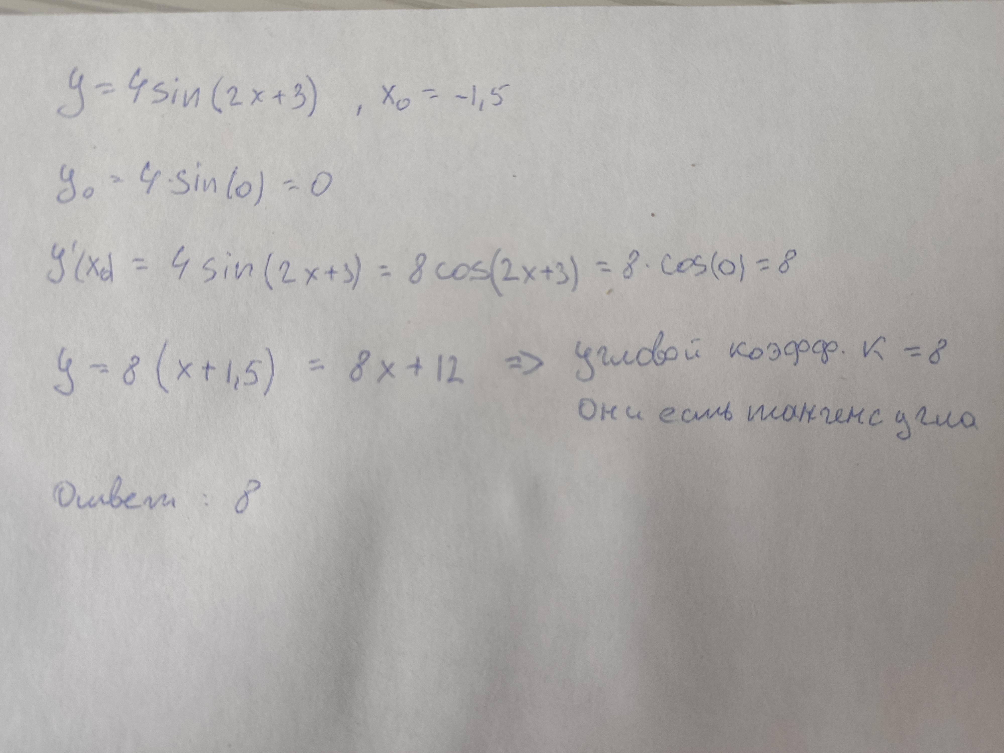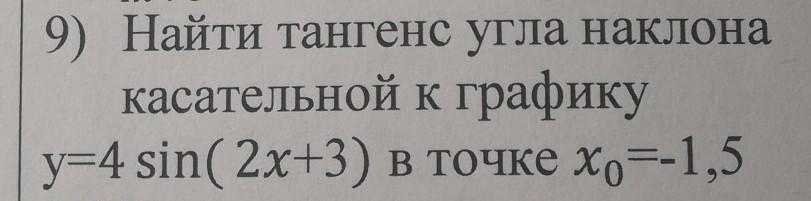 производные помогите пж найти тангенс угла наклона касательной к графику y=4sin(2x+3) в точке x0=-1.5