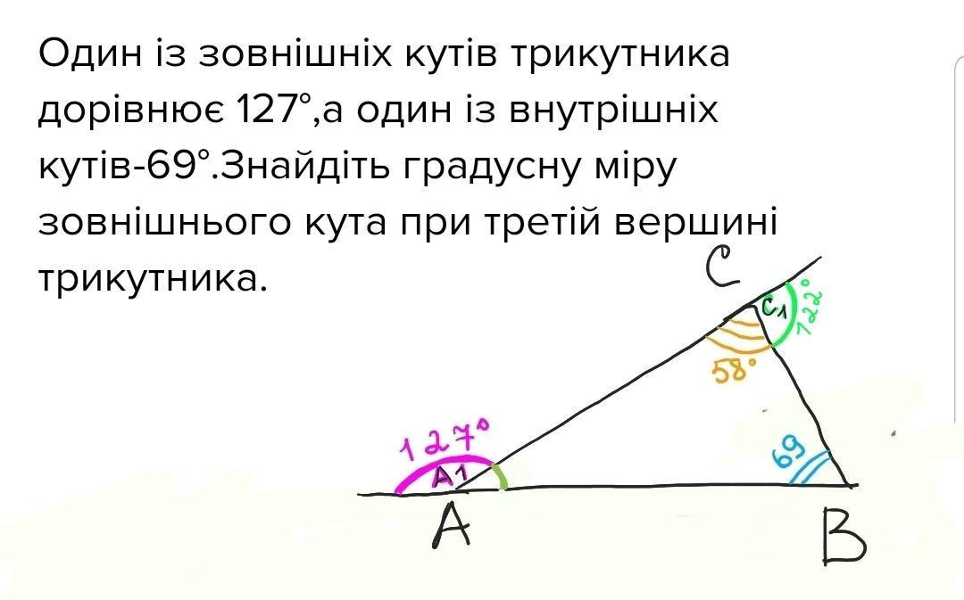 Один із зовнішніх кутів трикутника дорівнює 127°,а один із внутрішніх кутів-69°.Знайдіть градусну міру зовнішнього кута при третій вершині трикутника.