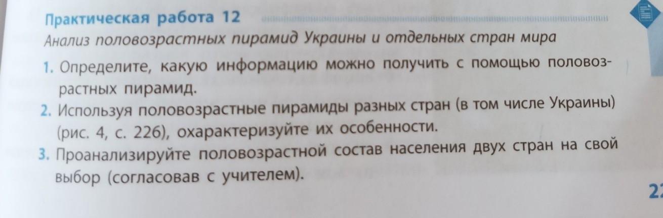 1. Віково-статеві піраміди являють собою діаграми, на яких кількість людей кожного віку (або їх частка у населенні) зображено горизонтальною смугою певного масштабу. Смуги розташовуються одна над одною в порядку збільшення значень віку, в лівій частині діаграми — для чоловіків, у правій — для жінок. Віково-статеві піраміди будуються, зазвичай, за річним або п'ятирічними віковими групами, а іноді і по десятирічних групах. Однак статево-вікові піраміди, побудовані за великим вікових групах, не розкривають детальні особливості вікового та статевого складу населення.