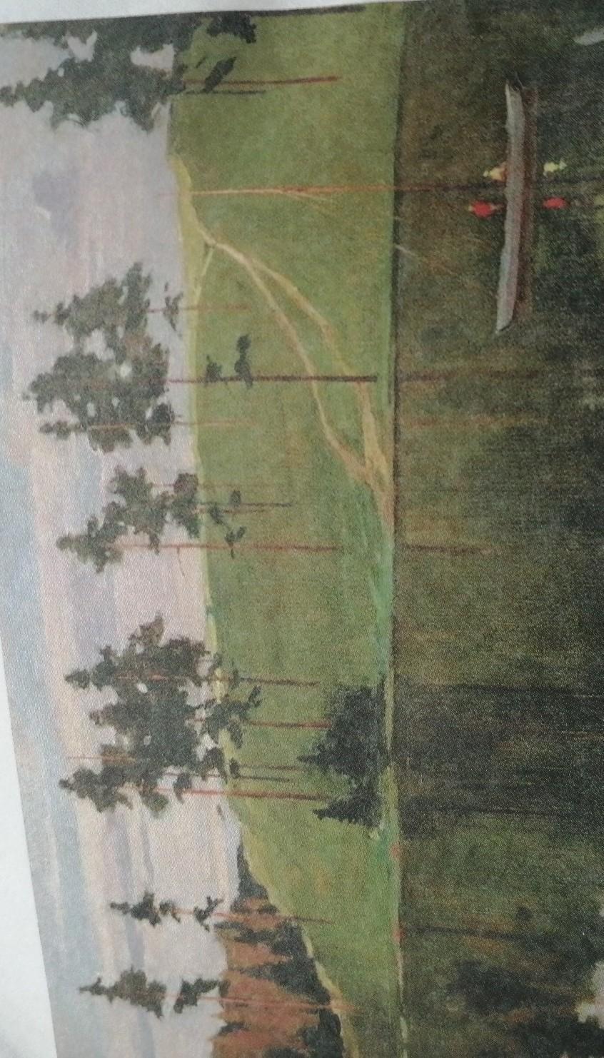 Солнце движется к закату. Его не видно за высокой насыпью противоположного берега. Заметно только, что верхняя часть холма ярко освещена солнечными лучами. Значит солнце еще не скрылось за горизонтом. А сам холм уже находится в тени. По его склону растут красивые высокие сосны. Нижняя часть стола почти до середины у них оголенная. И лишь затем начинается их темно-зеленая крона. А у самого подножия расположились несколько небольших пушистых елок. Вся поверхность холма покрыта зеленой травой. Сверху к реке ведет тропинка, протоптанная людьми. Ближе к середине насыпи она раздваивается и вновь соединяется у самой воды.