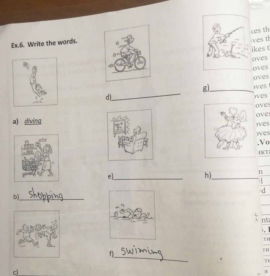 Ex.6. Write the words. (что изображено на картинках) что они делают. Дам 20 баллов. Помогите.