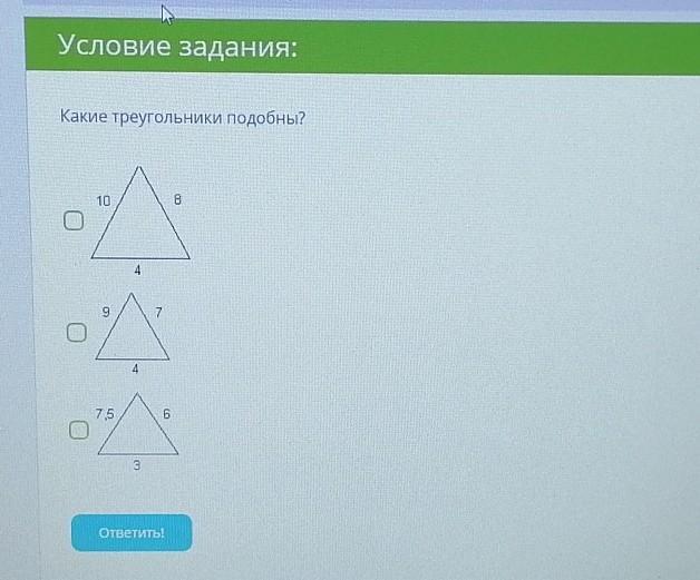 1 и 3 подобны, потому что отношение большей стороны одного треугольника к больше стороне другого равна отношение средних сторон и малых сторон. 10/7,5=8/6=4/3