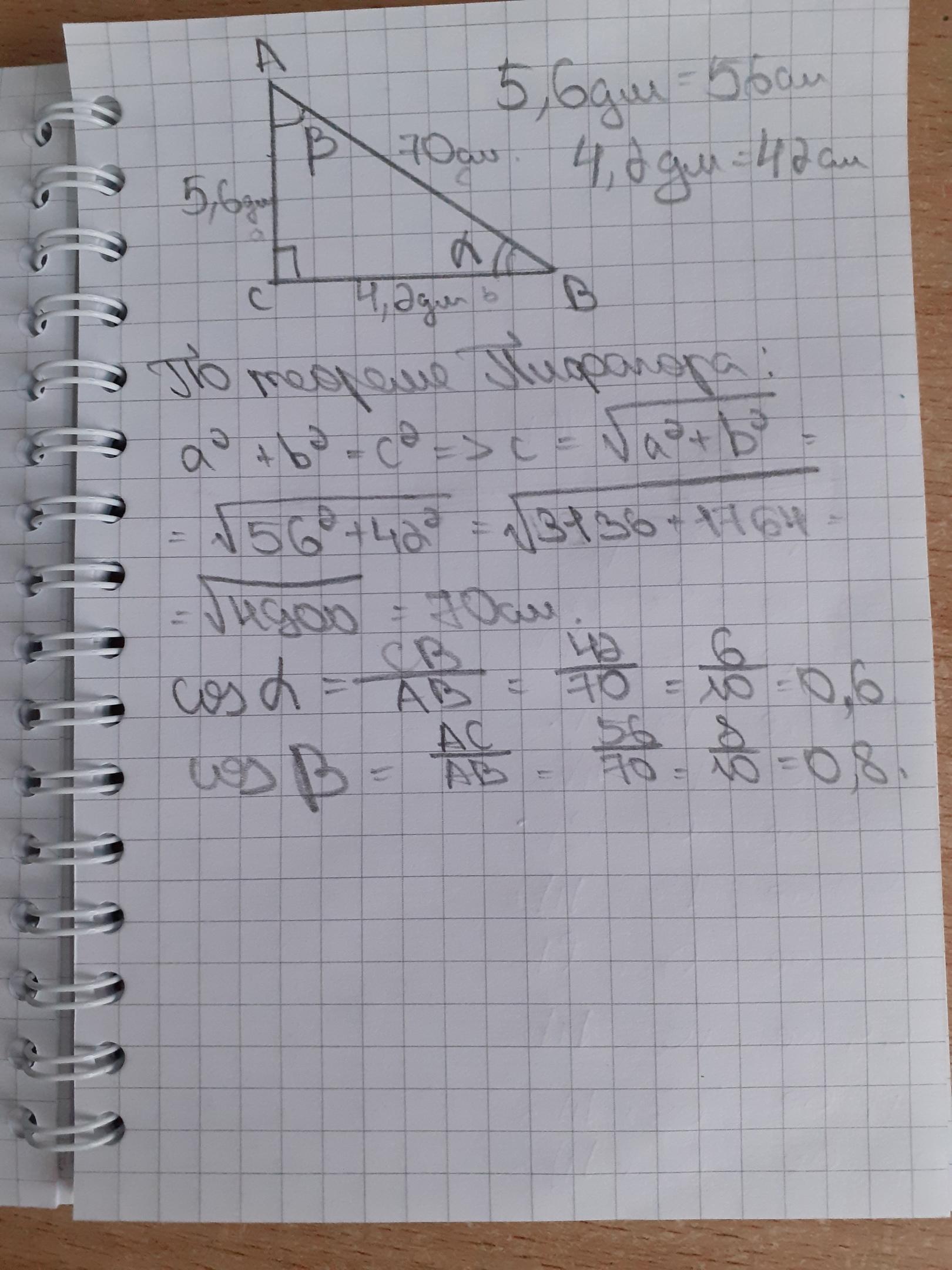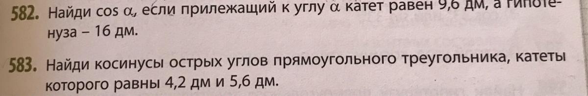 НОМЕР 583. Найди косинусы острых углов прямоугольного треугольника, катеты которого равны 4,2 дм и 5,6 дм. Ответ должен получиться 0,6 и 0,8