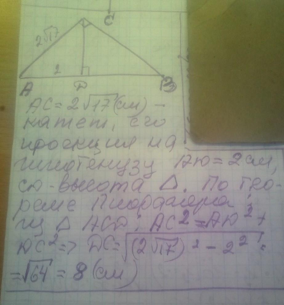 Катет в прямокутному трикутнику = 2√17 см, а його проекція на гіпотенузу = 2 см. Знайти висоту трикутника?