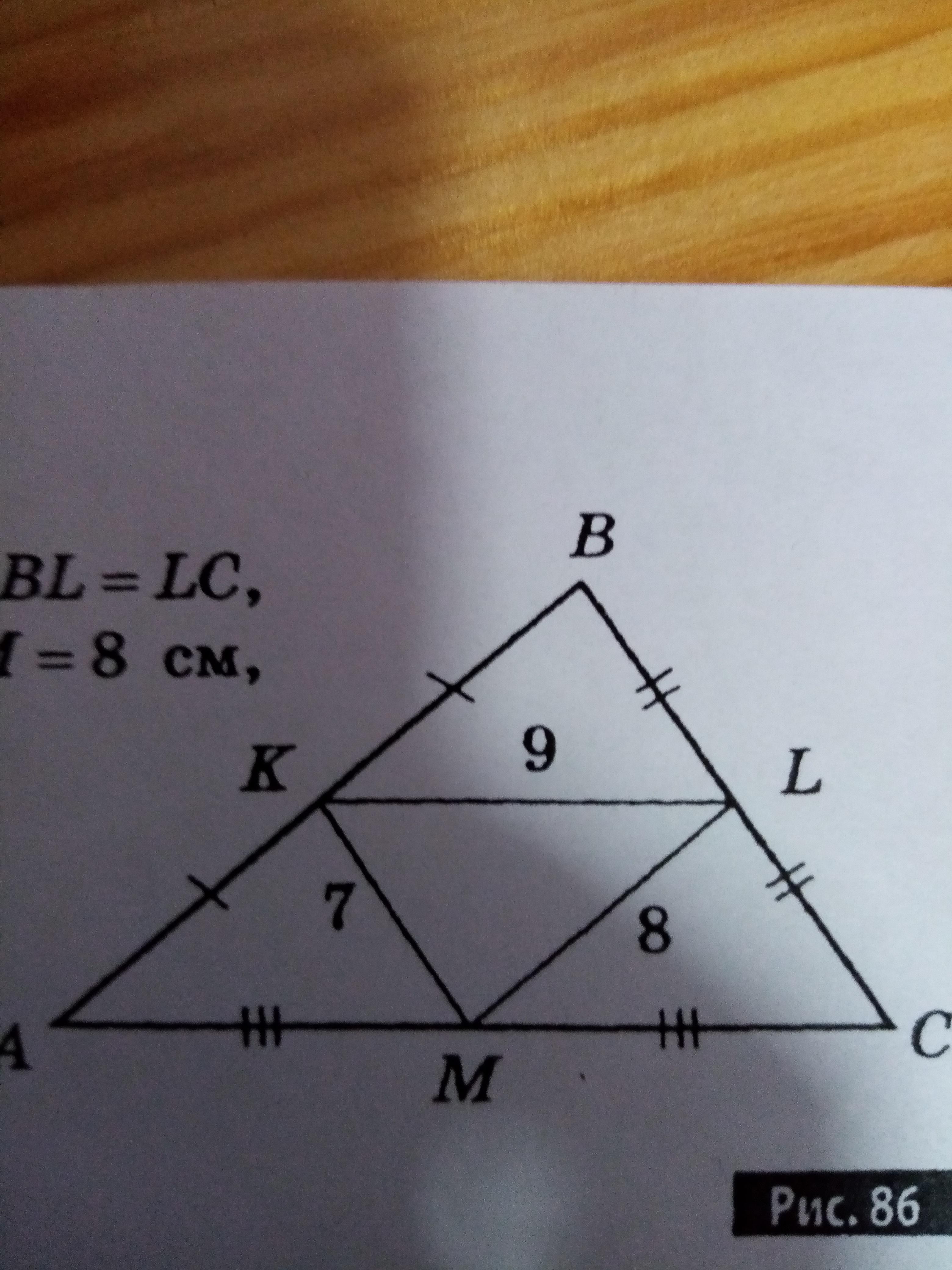 На рис. 86 ak=kb, bl=lc, am=MC, kl=9см, lm=8 см, km=7см. Найдите Pabc