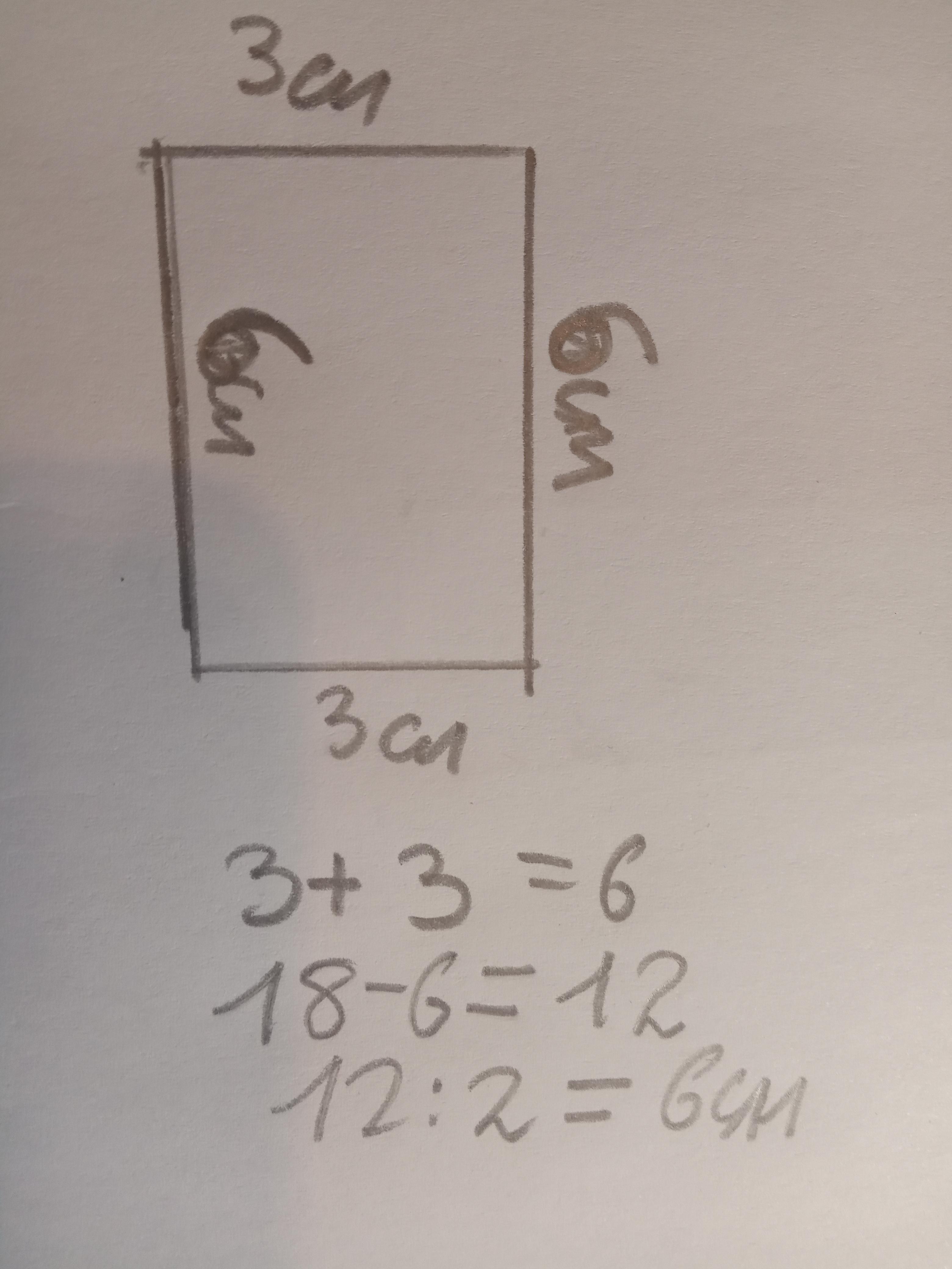 Если 1сторона 3см значит 2рая тоже ,18-6=12,12это сума 2ох других сторон (а они одинаковые) значит 12:2=6см