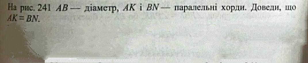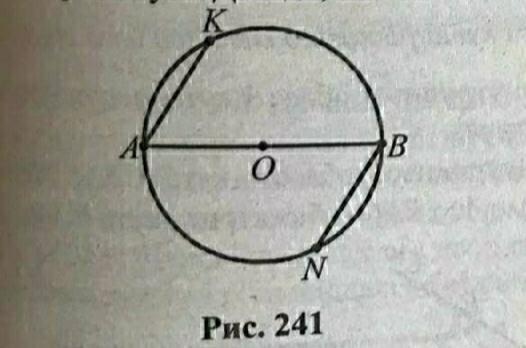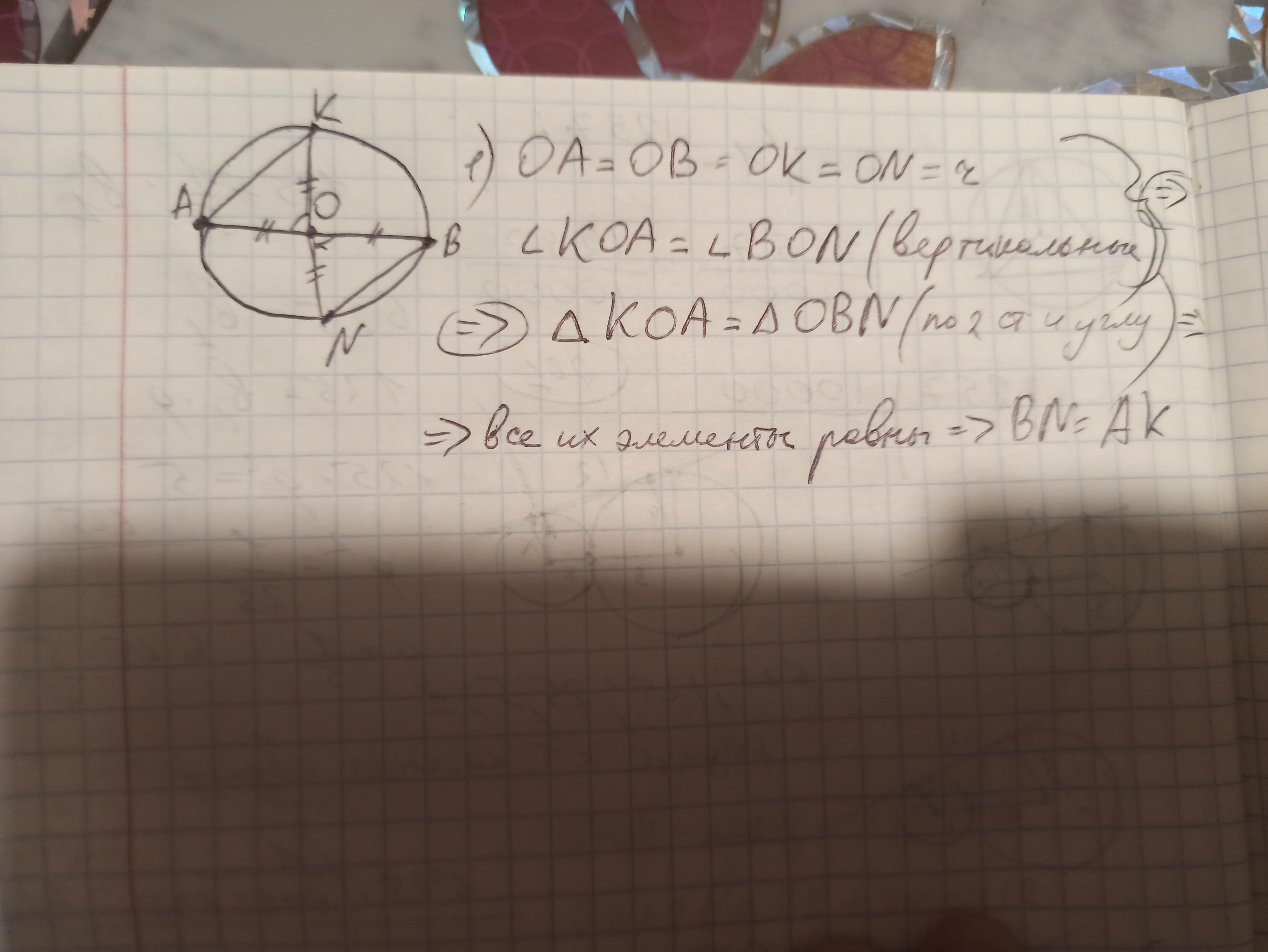 провед'м KN и видим что KN и AB равны как радиусы и точно О это центр, а значит их половины равны между собой соответственно. Угол AOK и NOB равны как углы между прямыми (смежные)