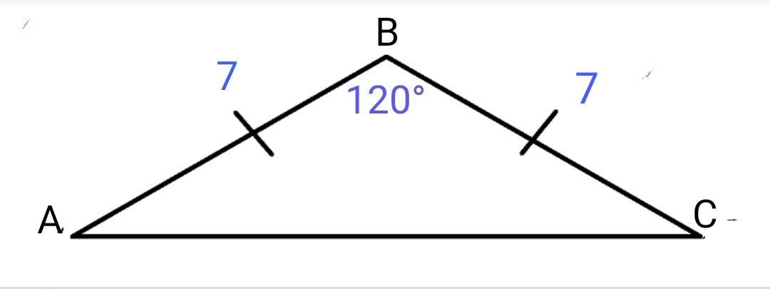 АС² = АВ² + ВС² - 2•АВ•ВС•cosB = 7² + 7² - 2•7•7•cos120° = 98 - 98•(-1/2) = 98 + 49 = 49•3.