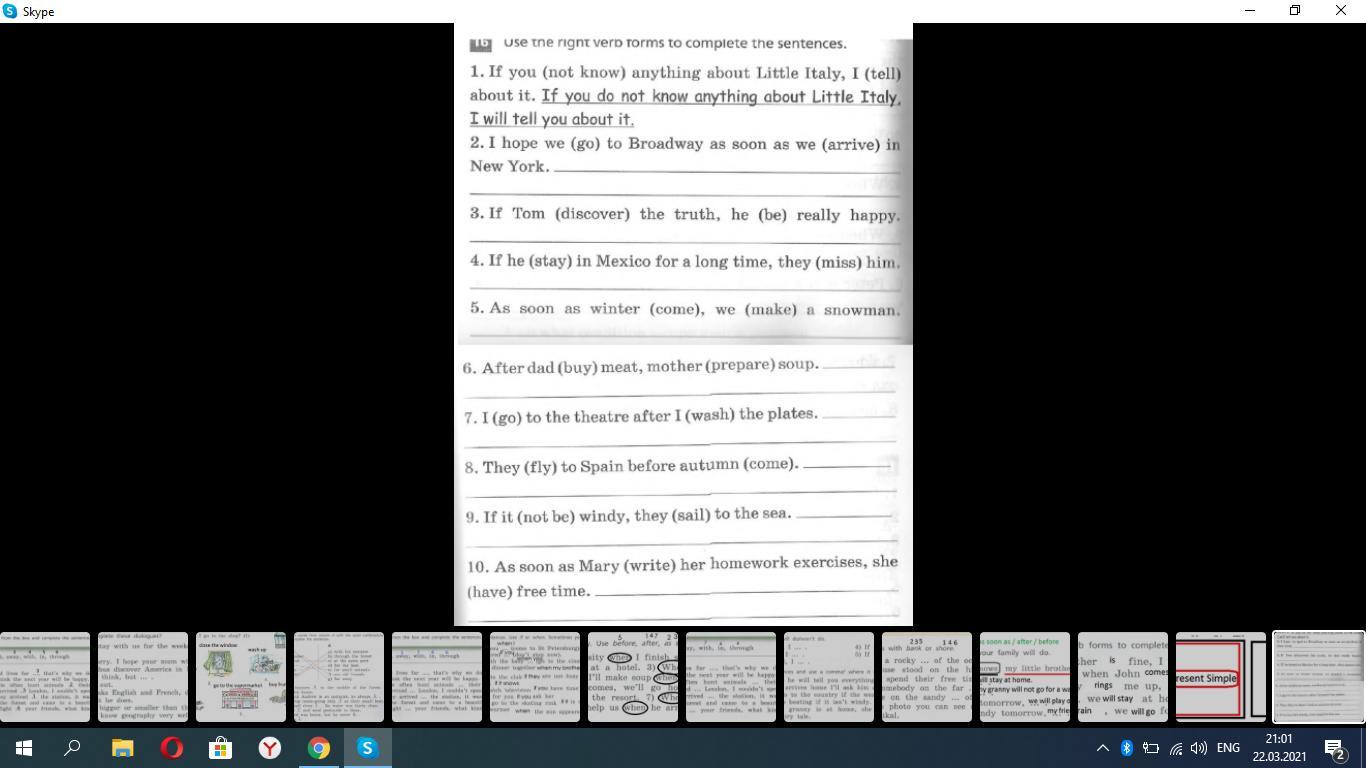 2) I hope we will go to Broadway, as soon as we arrive in New York. 3) If Tom discovers the truth, he will be really happy. 4) If he stays in Mexico for a long time, they will miss him. 5) As soon as winter comes we will make a snowman. 6) After Dad buys meat, Mother will prepare soup. 7) I will go to the theatre after I wash the plates. 8) They will fly to Spain before autumn comes. 9) If it is not windy, they will sail to the sea.
