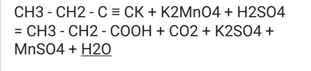 2H3C-CH2-C≡CK + 4K2MnO4 + 9H2SO4 = 2H3C-CH2-COOH + 2CO2 + 5K2SO4 + 4MnSO4 + 8H2O, элек. баланс:
