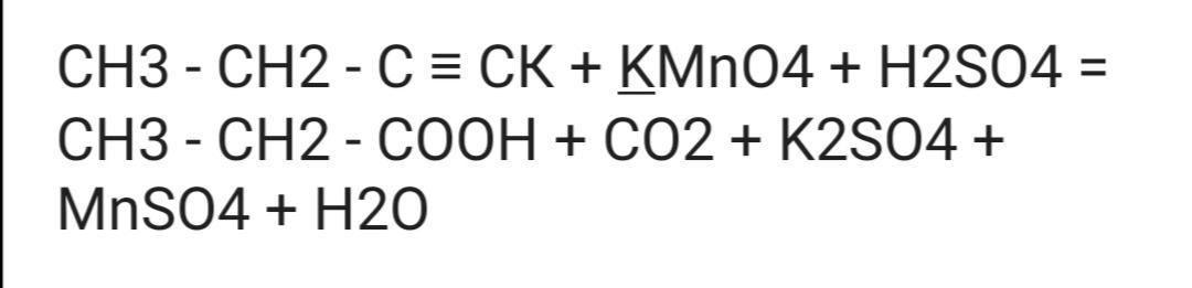 10H3C-CH2-C≡CK + 16KMnO4 + 29H2SO4 = 10H3C-CH2-COOH + 10CO2 + 13K2SO4 + 16MnSO4 + 24H2O, элек. баланс: